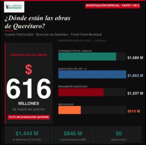 Lo que hace llamativo el subejercicio no es solo su magnitud, sino el contexto financiero en el que ocurrió: el municipio cerró el 31 de diciembre de 2025 con mil 444 millones de pesos en cuentas bancarias, un superávit operativo de 846 millones y deuda pública de cero pesos.