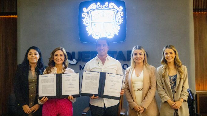 La secretaria de las Mujeres Sonia Rocha Acosta, llevó a cabo la firma del convenio de colaboración con el presidente municipal de Querétaro, Felipe Fernando Macías Olvera, y la secretaria de las Mujeres de la capital, Vanesa Garfias, el cual tiene como objetivo fortalecer la política pública en materia de atención, prevención y erradicación de la violencia contra las mujeres.