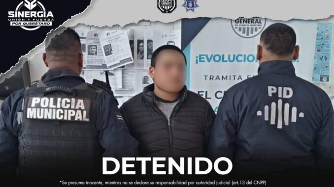 La Fiscalía General del Estado de Querétaro informó que, como parte de la estrategia Sinergia, fue detenido Osiel “N”, alias “Oshi”, quien contaba con una orden de aprehensión vigente por el delito de robo específico a comercio, por hechos ocurridos en julio de 2024 en la comunidad de Ajuchitlán, municipio de Colón.