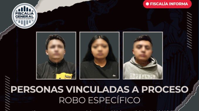 La Fiscalía de Querétaro obtuvo la vinculación a proceso de tres personas —dos hombres y una mujer— por su probable intervención en el delito de robo específico, cometido en agravio de una tienda ubicada en la comunidad de Villa Progreso, municipio de Ezequiel Montes.